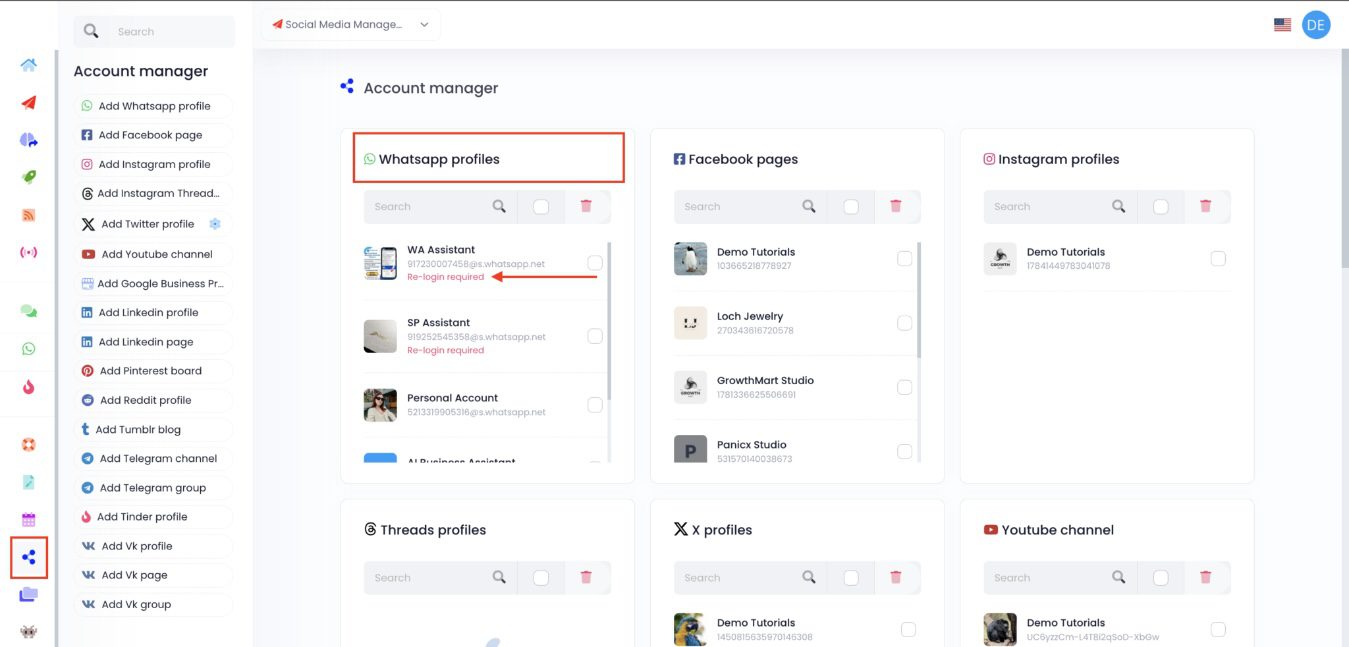Go to the account manager on the left sidebar and look for the Account Manager. Scroll to the WhatsApp section. If your account needs a re-login, you’ll see a tag that says “Re-login required”.